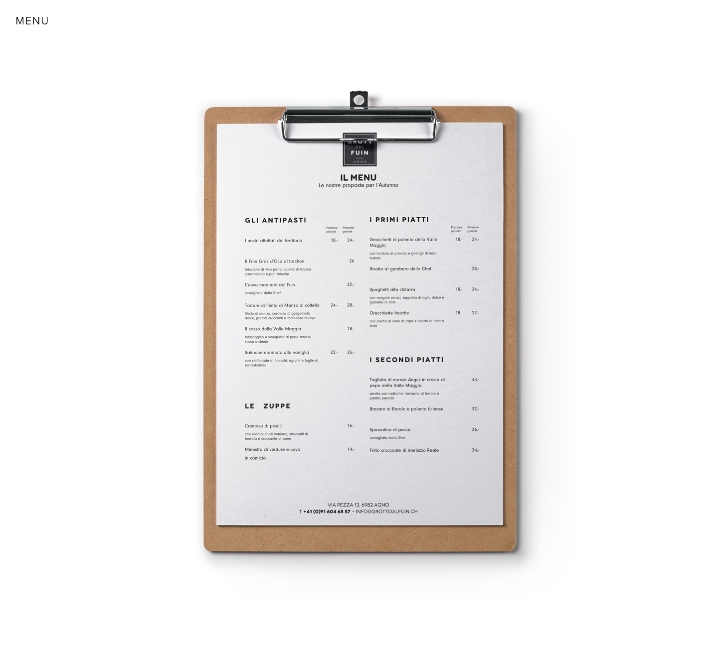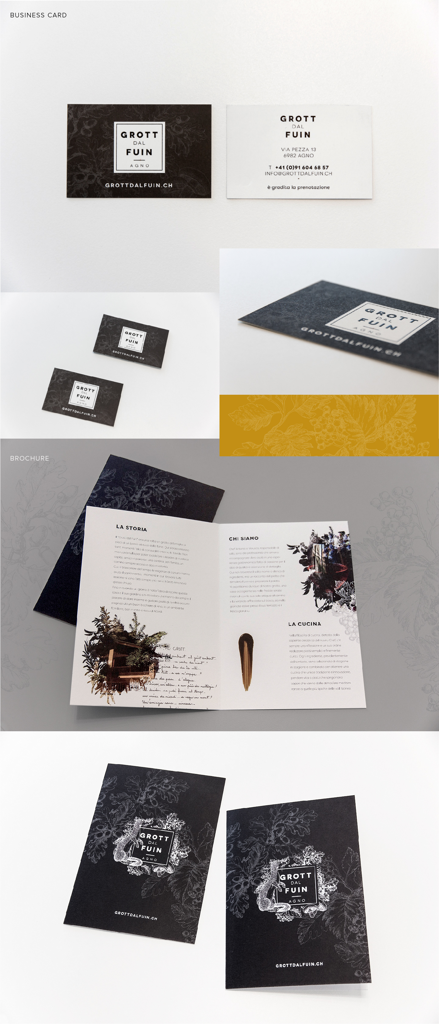 Grott da Fuin is a typical switzerland restaurant. It is located in a traditional country house named "grott". We designed logo and visual identity with an elegant but modern look.